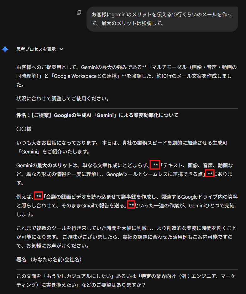 AI(GeminiやChatGPTなど)は、ユーザーに情報を分かりやすく伝えるために、重要な部分を太字「** **」で強調しようとします。