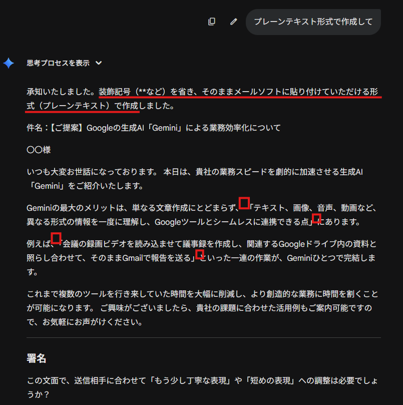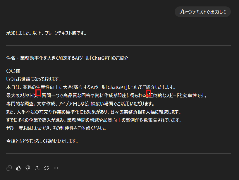 - 対策:指示文(プロンプト)に「プレーンテキスト形式で出力」と加える
