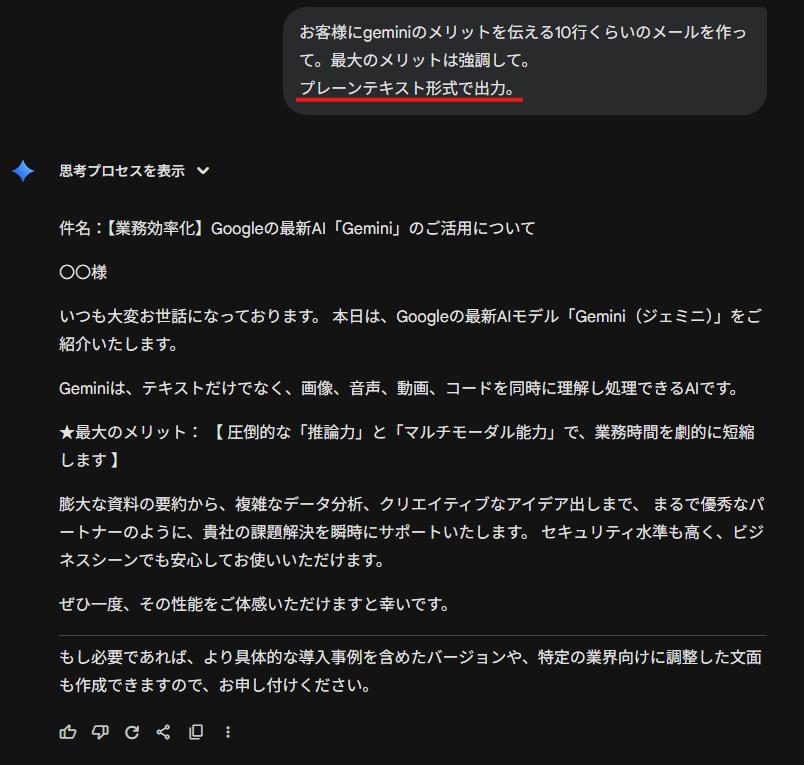 「装飾はいらないから、中身の文字だけください」と伝えることで、AIはマークダウン記法による記号を除いて、飾りのない(プレーンな)文章だけを返してくれるようになります。
