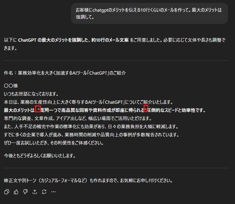 - メリット:コピペしてすぐに使える自然な文章になる