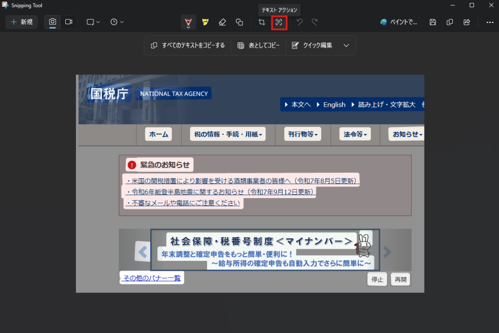 Snipping Toolの特に便利な点が、「画像内の文字認識(OCR)」機能です。