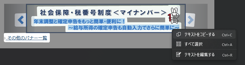 画面下部にあるバナー内の「年末調整と確定申告をもっと……」という文字を引用したい場合、通常なら画像なので文字選択ができません。