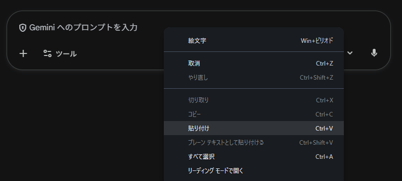 これだけでOKです。GeminiなどのAIチャット欄で右クリックして「貼り付け」を選びます。ショートカットキーで(Ctrl+V)でもOKです。