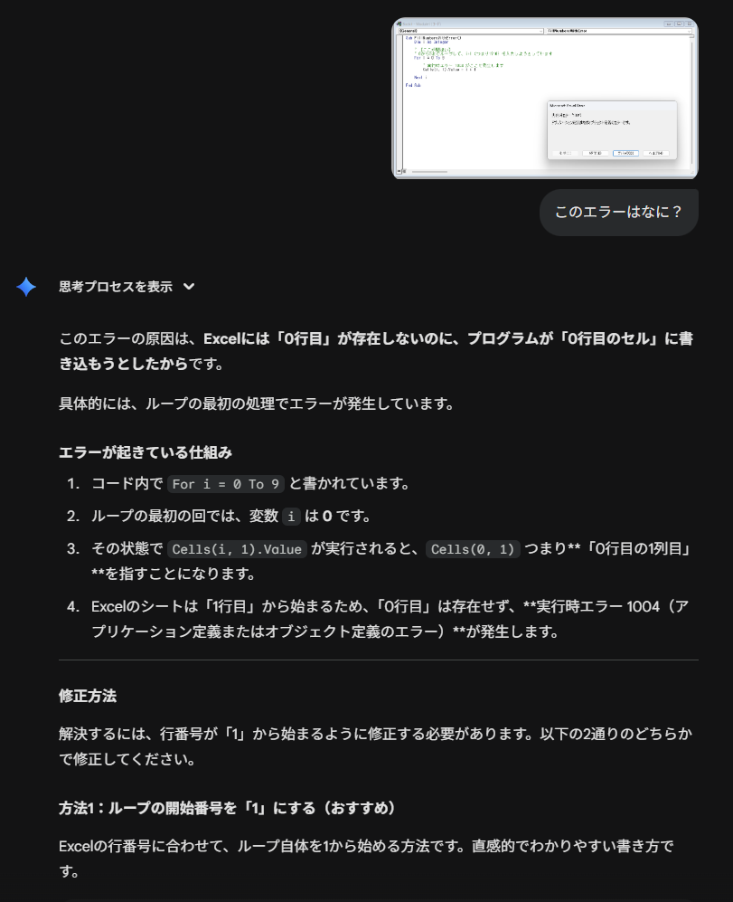 「実行時エラー ‘1004’……」と表示されていますが、何が原因かわからない場合、AIに聞くのが手っ取り早いです。